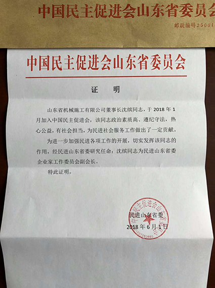 公司董事長沈繽同志于20181申請(qǐng)加入中國民主促進(jìn)會(huì),3月份中國民主促進(jìn)會(huì)山東省委員會(huì)正式批準(zhǔn)沈繽同志加入中國民主促進(jìn)會(huì)。