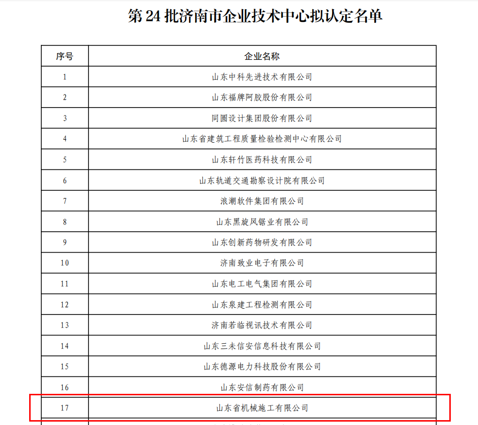 根據(jù)《濟(jì)南市企業(yè)技術(shù)中心認(rèn)定管理辦法》和《關(guān)于組織申報(bào)2022年度(第24批)市級(jí)企業(yè)技術(shù)中心的通知》要求,經(jīng)相關(guān)區(qū)縣推薦,市工信局組織專家進(jìn)行材料評(píng)審和現(xiàn)場(chǎng)考察,山東省機(jī)械施工有限公司獲評(píng)濟(jì)南市企業(yè)技術(shù)中心。