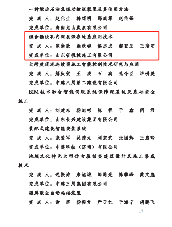 11月29日,濟(jì)南市總工會(huì)公布2023年度泉城職工全員創(chuàng)新創(chuàng)效競(jìng)賽結(jié)果,我公司研發(fā)的“組合錘法孔內(nèi)深層強(qiáng)夯地基應(yīng)用技術(shù)”被評(píng)為濟(jì)南市職工優(yōu)秀技術(shù)創(chuàng)新成果二等獎(jiǎng)。